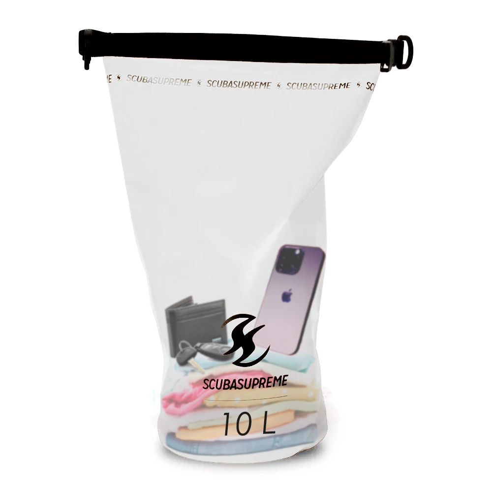 Bolsa seca impermeable de 10 litros con cierre enrollable y correa para el hombro. Ideal para proteger tus pertenencias del agua durante actividades al aire libre.